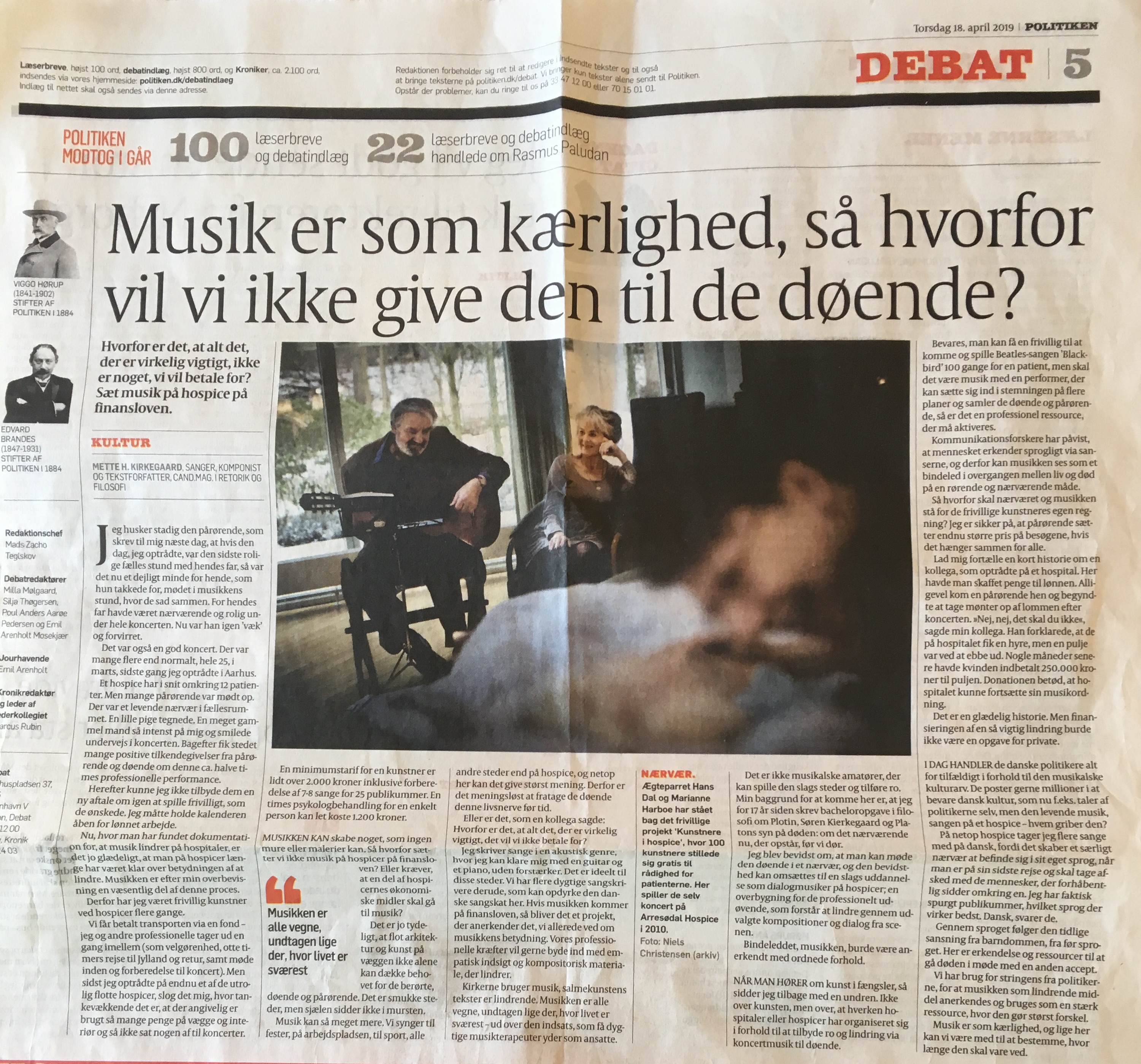 Læs debatindlæg i Politiken: Mette spiller for de døende, og hun har set, hvor meget mere musikken glæder end de mursten og malerier, der bruges så mange penge på